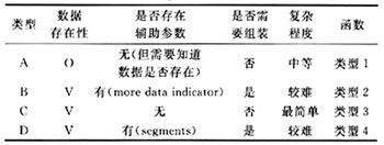表3中有两列内容分别是辅助参数和它们的存在性。辅助参数是指在相应消息中对于获取SDU有帮助的参数,而存在性就表示该辅助参数在相应消息中的存在可能,F和V表示一定存在,0表示可能存在。辅助参数的作用主要是用来告知消息中包含的Data是完整的还是需要分段传送的,如果完整,那么取得数据后函数就把PDU数据返回;否则要对来自多条SCCP消息的多个Data进行组装。在表3中用A,B,C,D对消息处理进行了分类,每个类型代表一种处理的复杂程度如表4所示。