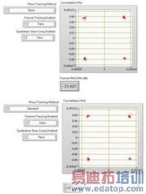 图9. 上图显示了80 MHz 802.11ac信号进行相位跟踪对EVM数的影响。该图表在256-QAM信号图中仅显示了4个符号。