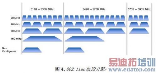802.11ac可支持5 GHz波段并强制包括20、40和80 MHz带宽。支持160 MHz当前为可选项。可选项还包括非连续80+80 MHz TX和RX带宽。