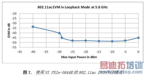 测试设备通常需提供比规范要求(如-32 dB用于256 QAM)高至少10 dB的测量能力,从而提供足够的空间用于特征和产品测试。如图7所示,NI PXIe-5644R可提供业界领先的EVM值。