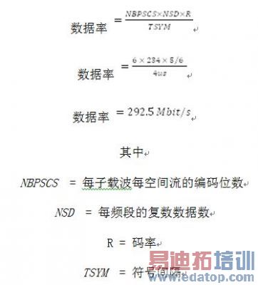 以下步骤可用于计算下列配置的数据率:80 MHz带宽、带800 ns保护间隔的64-QAM信号以及一条空间流。基本上有234数据载波(242—8导频)。符号率计算方式如下:256/80 MHz + 800 ns (GI)。将数值代入数据率公式可得: