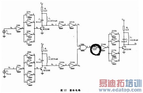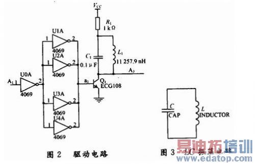 (2)信号处理模块。驱动电路设计(CD4069非门集成芯片);倍频电路设计(S9014或ECGl08三极管、104普通电容、11 257.9 nH自制电感、1 kΩ电阻);整波电路设计(CD4069非门集成芯片);和频电路设计(CD4081与门集成芯片);选频电路设计(S9014或ECGl08三极管、104普通电容、112.58 nH自制电感、1 kΩ电阻)。