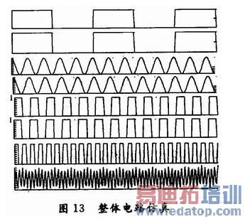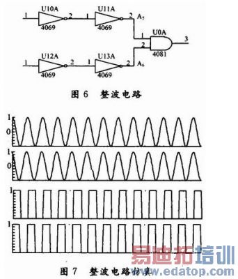 在本实验中运用的是CD4069集成非门电路,非门主要是将输入信号波整合成方波以便于后面与门对波的进一步处理。只要工作电压达到非门的开启电压经过这样的处理就可将输入波整合成方波,如图6所示。