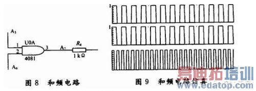 在本实验中运用的是CD4081集成与门电路,与门主要是将输入的两列方波信号相互作用后再输出,而后进入后面的5倍频电路进行进一步的处理。在本实验中与门起到了乘法器的作用,并且可以减少杂波的干扰,使实验效果更加良好。