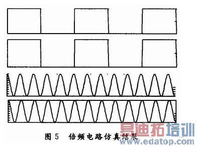 由单片机输出的信号频率即在A1点或A2点(0.03 MHz)经由5倍频放大后输出的信号频率应为输入信号频率的5倍即为A3点或A4点(O.15 MHz),仿真结果如图5所示。