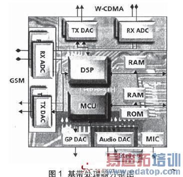 基带处理器块由正交(I/O)发射(TX)DAC和接收(RX)ADC对组成。在2G至2.75G GSM/GPRS/EDGE技术中,载波信道间隔限于200KHz,导致低频零IF。W-CDMA采用5MHz信道,对应的带宽较宽。