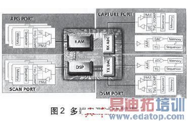 实现上述目标的两个主要功能是每端口定时发生器和每端口序列发生器,前者与测试芯核的频率相匹配;后者可工作在不同测试模式并自动地执行序列指令。每引脚多端口方案比上述方案更进一步,将ATE系统的数字和模拟两种资源的粒度细分至每个引脚 。测试典型SoC的必备的资源结构实例包括:用作通信处理器的DSP、存储器,以及与模拟IF或RF前端接口的ADC和DAC。在本场合,数字引脚配置成扫描模式,用来测试DSP芯核(见图2)。