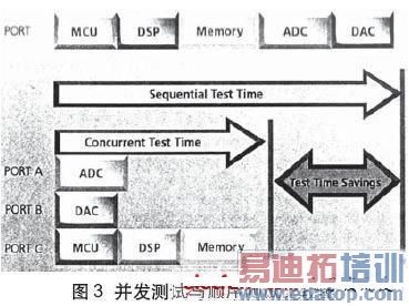 并发测试是多端口测试的扩充,让这些芯核并行地进行测试。当然,器件中每个芯核应是ATE系统可独立地访问和控制的,能独立工作的。将每个器件芯核串行测试的纯序列流修改为多个器件芯核并行测试的序列流,能大大减少测试执行时间(图3)。