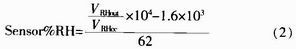 值得一提的是电压VRHoc并非恒等于5 V,事实上受到技术上和电网等干扰的影响,其电压是在5 V附近有微小的波动。公式(2)是在25℃时传感器输出和湿度的关系,当环境温度改变时应进行温度补偿,补偿公式为: