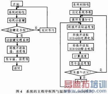 软件是系统功能实现中最为关键的部分,它的完成与实现也决定了整个设计系统的正常运行的成功与否本系统的软件设计主要包括温湿度检测、LCD显示、键盘等程序设计。因为DS2438单总线期间对时序的要求非常严格,对温湿度检测采取汇编语言进行编写,而LCD和键盘驱动则采用C语言进行编写,整体采用目前流行的C语言与汇编嵌套的编程思路。这样做的目的是既能达到DS2438的时序要求高的要求,义能以最少的工作量完成整体的程序设计。系统的主程序框图与温湿度检测模块框图如图4所示。
