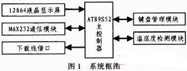 因为本系统是以嵌入式微控制器为核心,它控制本系统的各模块功能,因此选择性能可靠、发展技术成熟的AT89S52单片机为本系统的控制器。本系统主要完成中央空调温湿度信号的采集,信号的处理,以及液晶实时显示等主要任务。下位机由微控制器、温湿度传感器、LCD显示器、键盘输入等组成,其中,温湿度检测模块采用单总线实际方案,仅需1根线实现电源及双向数据传输。其任务是完成中央空调送风口的温湿度信息的采集。上位机主要实现对下位机进行控制,根据温湿度传感器提供的参考数据实现对送风口温湿度的有效的、合理的控制。中央空调温湿度检测系统框图如图1所示。
