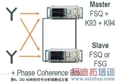 对于2X2 MIMO的信号分析端测试方案如图6,即用两台R&S公司的高端频谱仪FSG或信号分析仪FSQ模拟两个接收通道,通过使用一个外部的相位相关盒实现两个接收通道之间的相位相关。