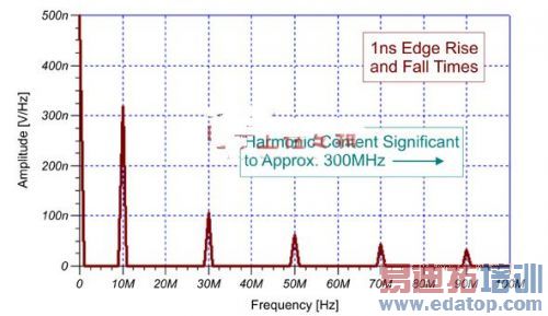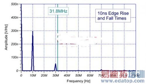 10 ns边缘率时方程式结果为约31.8 MHz。曲线图显示,最后一次明显谐波出现在30 MHz。同时,图2所示1 ns边缘率时方程式结果为318 MHz最大频率。如果您的电路易受 318 MHz频带内产生的频率影响,则EMI谐波可能会使您的电路出现干扰。