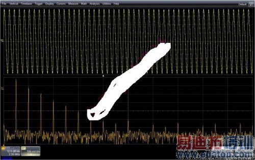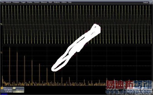 力科HRO不仅ADC位数比其他实时示波器高,也有极低的噪声水平。其典型的信噪比为55dB,而8位示波器一般只有35~40dB。图3是将一个多谐波信号分别输入到8位和12位示波器,转化到频域观察的图形。两者频域的垂直刻度和基准都一样。从图中可以看出,12位示波器的频域噪底比8位示波器低大约10dB。