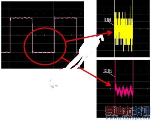 ADC位数对垂直分辨率有多大影响?我们来看图1,这是用8位示波器和12位示波器分别对同一个信号采集后,对其中部分波形放大显示的结果。