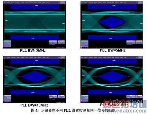 如下图5为使用力科示波器测量某2.5Gbps信号,当示波器的串行数据分析软件的PLL带宽在2MHz、5MHz、10MHz、20MHz四种设置下的眼图测量结果,可见,PLL带宽越高,眼图越清晰,抖动越小。问题是,待测试电路的收发器RX端接收到的、真实的眼图和抖动是什么样呢?答案是必须把示波器的CDR参数设置得和待测试电路RX端的CDR参数完全一致,这样示波器的测量结果才具备参考价值。