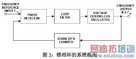 如图2为PLL的系统图,包括鉴相器(phase detector)、环路滤波器(loop filter)、压控振荡器(voltage controlled oscillator,简称VCO)三个基本部分。PLL的工作原理请参考模拟电路书籍。