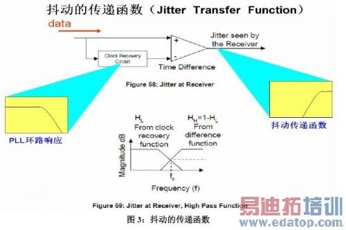 在接收端的PLL中,鉴相器、环路滤波器和VCO三部分组成的环路的频响为低通滤波器特性。如下图3所示,接收端的时钟恢复电路的频响是一个低通滤波器,其传递函数为HL, 当串行数据信号的抖动变化频率较低时,即从直流到PLL的截至频率,PLL能及时追踪到数据跳变沿(即锁住相位),输出的时钟与输入数据同相(严格讲相位差为固定常数),这样抖动为零。当连续边沿的抖动变化太快时(即存在高频抖动时),PLL不能及时追踪到边沿的变化,于是输出的时钟和数据边沿存在抖动,所以,接收端的CDR不能滤除高于截至频率的抖动,它的抖动传递函数(Jitter Transfer Function简称JTF)的频响为高通滤波特性,接收端CDR又称为TIE抖动的高通滤波器。如图3,抖动传递函数HH=1-HL。