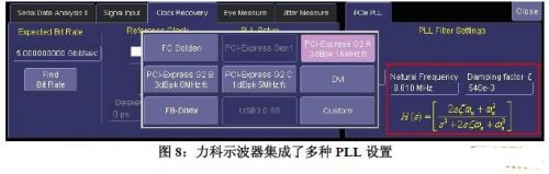 如下图8所示,在力科SDA中,集成了FC Golden, PCIe Gen1, PCIe Gen2, DVI, FBDIMM, USB3.0和Custom多种PLL参数设置,测量时根据待测试信号的类型选择合适的CDR设置。