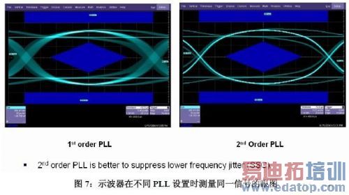 图7所示为某2.5Gbps信号,CDR使用一阶PLL或二阶PLL的眼图测量结果,可见,使用二阶PLL得到的眼图非常清晰、抖动更小。二阶PLL可以更大程度的减小低频抖动,通常用于带有扩频时钟(SSC)的串行数据信号,比如计算机主板上的SATA和PCIe。