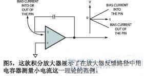 Paul Grohe 是美国国家半导体公司的一位应用工程师,他提供了另一个测量微小电流的出色案例。数年前,美国国家半导体公司决定销售 LMC6001,这是一款保证 25 fA 偏置电流的放大器,这意味着该公司需要测量每只器件的偏置电流来验证规格。测试部门无法在计划阶段提供测试设备,所有电路必须装到一个标准的探测卡上。Grohe和同事Bob Pease建造了一个用于概念验证的装置,以证实解析低达1fA小型测试电路的可行性(图4)。很多书籍与讨论中都采用一只积分电容器来测量小电流(参考文献3)。它的原理是,一个小电流可以为一只小电容器充电,你可以读出电压值来推算电流。在某些情况下,电流是来自传感器的外部电流。此时,电流正离开放大器的输入脚。图 5 是一个简单的原理电路,其中的放大器正在测量自己的偏置电流。
