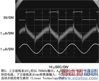 Williams通过Tektronix CT-1的七个采样组,研究了这种增益误差校正对一个正弦频率(32.768kHz)的有效性。他报告说,对一个1mA、32.768kHz 的正弦波输入电流,该器件的输出全部都在 12% 的 0.5% 以内。尽管这些结果看似支持这种测量方案,Williams 仍认为值得说明一件事,即结果来自 Tektronix 的测量。他说:“Tektronix 并未保证低于所规定 -3dB、25kHz 低频滚降时的性能。A3 和A4提供的增益为200,因此放大器总增益为224,000。这个数字在A4产生一个针对CT-1输出的1V/mA比例因子。A4的 LTC1563-2 32.7 kHz 带通滤波输出通过一个以 LTC1968 为基础的rms-dc转换器送给A5,该rms-dc转换器提供电路的输出。”Williams 解释说,信号处理路径组成一个频带极窄的放大器,该放大器调谐到晶体的频率。图3画出典型的电路波形。据 Williams说,该晶体在C1的输出端驱动(上迹线),产生一个530nA的rms晶体电流,分别显示为A4的输出(中间迹线)和rms-dc转换器输入(下迹线)。他说:“中间迹线可看到尖峰,这是来自与晶体并联寄生路径的未过滤成份。”