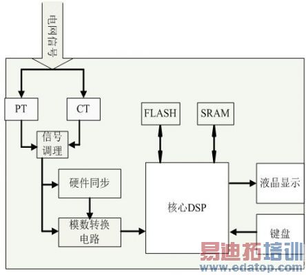本系统主要是由核心DSP、模数转换电路、液晶显示电路以及键盘电路组成。电网信号经过电压互感器和电流互感器后,由信号调理电路变为模数转换电路能够处理的信号,然后送入模数转换电路,将模拟信号变为离散的数字信号,采样到的数据经过DSP芯片的分析计算后送入到液晶电路,对计算后的数据进行显示,以供查看。键盘主要用来控制液晶对数据的显示,控制液晶进行翻页等功能,系统框图如下: