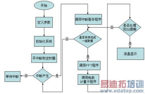 本系统的软件主要是完成对信号的采样、对采样数据的FFT变换[4]、对变换后的数据进行谐波的各项参数(谐波的幅值、有功功率、视在功率、功率因数、谐波含量)等的计算以及对计算后的数据进行显示等。软件流程图如下:
