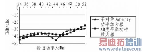图3 不对称Doherty功放与AB类平衡功放的IMD3比较曲线图