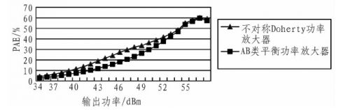图2 不对称Doherty功放与AB类平衡功放的PAE比较曲线图