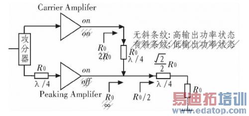 由图1可以看出,传统Doberty结构的功率放大器有两种工作状态:低输出功率状态(图1中的有斜条纹)和高输出 功率状态(图1中的无斜条纹)。在高输出功率状态,理想情况下2个放大器的输出电流大小相等,载波放大器和峰值放大器产生相等的输出功事。这时载波放大器和峰值放大器的负载阻抗都为R0,通常情况下R0=50Ω。在低输出功率状态,峰值放大器截止不工作,只有载波放大器导通工作。理论上此时的峰值放大器的输出阻抗趋于无穷大,峰值放大器对负载网络阻抗的影响可以忽略。载波放大器输出端的负载阻抗通过特性阻抗为的R0的λ/4微带线将的R0/2变换到2R0,这样可以实现在低输出功率状态下高的负载阻抗达到效率的提高。此时载波放大器的饱和输出功率要比总的峰值输出功率小4倍,即传统Doherty功率放大器在低输出功率区域的饱和输出功率要比峰值饱和输出功事低6 dB,从而实现了提前饱和的目的,提高功率回退时的效率。