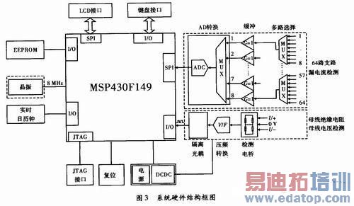 64路支路漏电流检。非接触式漏电流传感器送过来的直流感应电压经过8个8选1模拟开关(CD4097)选择,形成8路直流电压信号。为了降低ADC芯片输入阻抗对测量精度的影响,用高输入阻抗的运放对该电压信号进行射随缓冲后送到A/D转换器TLC2543的8个模拟信号输入端。A-DC芯片内部自动进行通道切换,循环采集8个输入端的模拟信号,采集到的数据通过SPI串行通信总线送处理器MSP430F149。