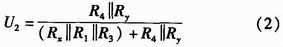 如图2所示,U+和U-为被测线路的母线供电电压,正常工作时两母线间的电压差Ux+y为440 V,且随蓄电池内阻变化。Rx,Ry分别为被测线路的正母线绝缘电阻和负母线绝缘电阻。正、负母线绝缘电阻反映的是64路的正、负支路的总体绝缘性能,等效于各个支路的正、负绝缘电阻的并联,正常时两母线绝缘电阻>20 kΩ。Ux和Uy为正负母线对地电压,大小随正负母线的绝缘电阻变化,但两母线电压差恒定为Ux+y。为了检测正负母线电压Ux,Uy,Rx,Ry,系统采用了“平衡-不平衡检测法”检测母线电压和母线绝缘电阻。计算公式如式(1)所示。