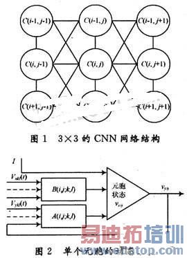 CNN的基本组成单元是元胞(Cell),每个元胞只同他周围r邻域的元胞相接,连接的个数Nr=((2r+1)2-1)。如图1所示为一个3×3规模的CNN网络结构。用C(i,j)表示第i行、第j列的元胞。C(i,j)只与C(i+1,j),C(i-1,j),C(i,j+1),C(i,j-1),C(i+1,j+1),C(i+1,j-1),C(i-1,j+1),C(i-1,j-1)等8个元胞相连。如图2所示,每个元胞都有一个状态vxij,一个恒定的输入vuij,一个输出vyij,门限I。标准CNN的状态方程可用下述一阶非线性微分方程描述: