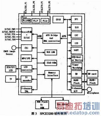 其具体特性如下:工作电压:I/O端口的VDD 3.0~3.6 V。CPU内核的VDD为1.62~1.98V;CPU工作频率:27~162MHz;SDDRAM最大容量可达16 MB;具有32位/16位的SDRAM数据总线;可编程选择颜色模式4/16/64/256/32768/65536;共6个16位CCP定时/计数器(具可编程自动重载功能);提供40个中断源,分别为定时器、时基、外部输入以及键唤醒等;支持键唤醒功能;USB功能:支持USB1.1主机或USB1.1外设;UART功能;具有通用异步接收机和发送机;提供串行外围设备接口(SPI),具主/从模式;提供Sunplus串行输入,输出接口(SIO);内置Watchdog功能;提供LCD接口,具TFT方式/CSTN方式;支持CCIR-601/656 CMOS影像传感器/TVE控制接口;支持SD卡和NAND型Flash,用于海量数据存储。图3为SPCE3200的结构框图。