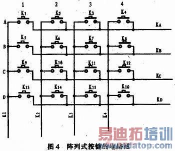 按健输入模块则利用了SPCE3200系统自带的4x4阵列式按键,初步定义使用6个按键,并通过Key.h对测试过程中所需的方向键、开始键及结束键来进行定义,图4为阵列式按键的电路图。