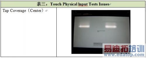 在打点测试部分,电容式或光学式面板都容易Fail;举电容式面板来说,因其技术特性为利用排列的透明电极与人体之间的静电结合所产生的电容变化,从所产生的诱导电流来检测其坐标。在作Tap Coverage——Center(表三)时,一些比较特定的位置就容易打击不到测试要求的点;尤其,整个微软制定的测试要求为50点的位置都要过,只要发生一次Fail就需要重新调整算法及分位。