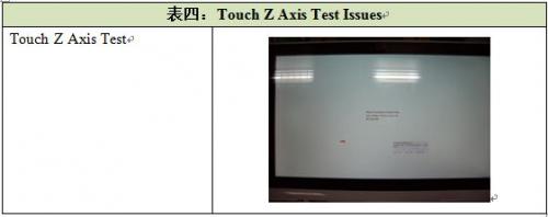 对使用者来说,如果在使用触控面板过程中发生因为面板太过敏感,使用者尚未触控到点位时就发生了反应,这样的状况会造成很大的困扰。所以在测试面板时,Z轴的触控测试是需要注意的一个项目。厂品的算法或电流反应设计的不佳时,就会造成触控面板有类似腾空的触控反应。微软也特别在这个方面有相关的规范,在0.5 millimeter以内就有触控反应的结果是定义为Fail的。