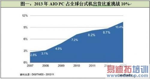 根据Digitimes Research报告指出,全球触控面板出货量预计在2013年达到17.5亿片,较2012年同比成长17.2%.其中,手机所使用的触控面板依旧为最主要应用类别,其出货量约为12.8亿片,较2012年成长14.2%,且占整体73.0%.平板电脑的出货量约为2.3亿片,占整体13.3%而居次,同比成长38.2%;触控式PC的出货量则为2,633万片左右,同比成长251.3%.值得注意的是,触控式PC的需求呈现极大幅度的成长,这不仅显示大尺寸PC在触控面板具有市场优势外;Digitimes Research也预估(见图一),AIO PC占台式机出货将持续攀高,估今年约8.7%,明年可望上看10.4%.