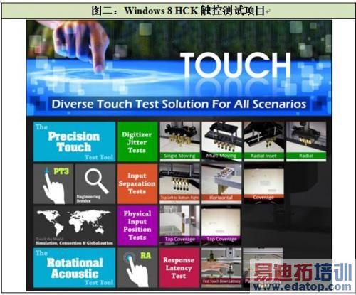 为了让整个Windows 8的触控反应与使用者经验能达到最高水平的要求,微软针对各厂商的触控屏幕效能,建立一套完整的认证标准,包括多点触控、触点精准度以及偏差值的验证外,触控屏幕本身也不能有噪声(noise)或延迟(latency)干扰的问题存在,才能符合Windows Touch Logo的认证标准。由于新一代触控屏幕必须搭载Windows 8操作系统;因此在认证测试上,将针对触控屏幕产品进行验证,而非验证单一触控芯片组而已。另外,现阶段Window 8触控认证的限制较多,除了微软所要求的指定测试仪器外,测试后的结果还必须送往WTTL(Windows Touch Test Lab)进行再次验证,才能成功地获得Windows 8触控认证。