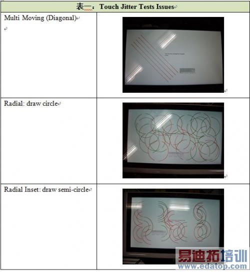 在验证Touch Jitter Tests时,因为触控手势所画的线在抖动(Jitter)超过1 millimeter就会Fail,而在一般垂直或水平的画线测试上,电容式与光学式面板都没有太大的问题。然而,当画线测试为五条斜线、画圆圈或画半圆时(表一),不论是电容式或光学式触控面板皆容易受到静电反应不良或线路遮蔽的影响而产生误差,造成测试Fail,因此厂商必须不断的根据测试结果的分位进行调整才能通过测试要求。