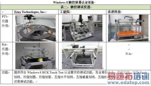 为了优化整个触控屏幕的使用性,微软针对触控屏幕认证订立完整且严谨的测试计划,不外乎是为了让中、大尺寸的触控屏幕也能拥有最完美的触控反应。尤其在拖曳屏幕对象的操作测试,必须以单指、双指、多指、两指轮替、单指划线、五指划线等繁复的测试项目为标准,通过才能达到触控屏幕功能正常表现。为此,百佳泰拥有最完善的触控测试仪器(表一),针对不同测试项目与需求,提出最可靠的触控测试解决方案。开发商的产品必须通过以图二为例的触控测试,才能呈报结果至WTTL进行复测,全部都通过认证后才能获得Windows Touch认证资格。