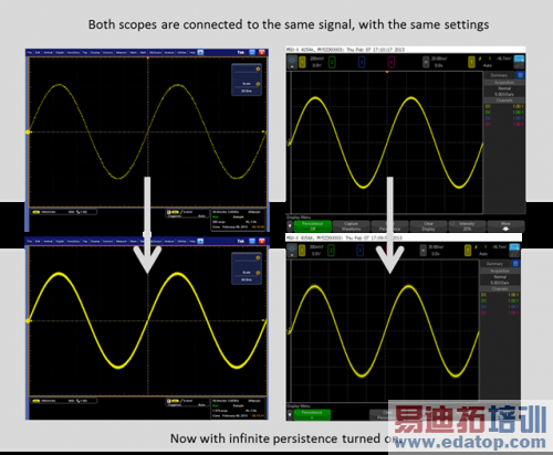 Now with infinite persistence turned on. 两款示波器连接到同一个信号,采用相同的设置