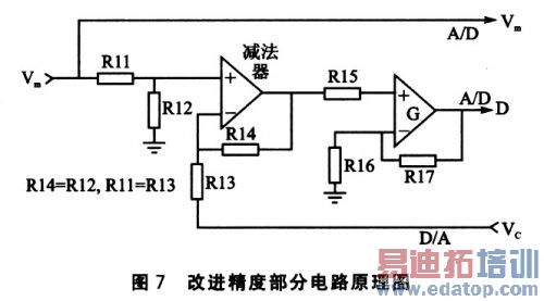 误差的引出可以用D/A来解决,把A/D读进来的数据再用D/A处理一次送出来,和原来的数据做一次减法就可以得到。误差没法直接再送回A/D,但可以将其放大后再送回,再使用68HC908QT4中的另一路A/D将放大后的误差进行A/D变换,MCU得到结果后缩小相同的倍数,与原A/D变换结果相加,便是更精确的结果。图6中,整个系统可分为压力传感器模块、模拟部分、单片机部分和输出电路部分,精度提高的关键在模拟部分的设计.如图7所示。假设放大器G的放大倍数为10。A/D的性能本身并没有提升,精度仍为R=19.61 mV/bit,这个值也就是极限值。放大10倍后,原来的最大误差19.6l mV/bit被扩大为196.1 mV/bit,A/D处理的是放大后的数据,其能力就被放大了10倍。数据处理时又会将其除以lO恢复,从整体上来看就好像精度R除以10了一样,变为1.961 mV/bit。