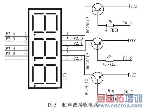 在显示模块选择时有两种,一种是用液晶显示屏,其具有轻薄短小,分辨率高,可显示汉字等各种符号的优点。但一般需要利用控制芯片创建字符库,编程工作量大;一种则是选用数码管,数码管具有低电耗、寿命长、易于维护的特点,同时精度比较高,称量快,精确可靠,编程容易,操作简单。缺点是不能实现汉字及多数据多行显示。综合考虑本次设计中选择了3位数码管显示。用PNP型三极管驱动数码管,并连接到单片机AT89C52的P0口上作位选。虽然显示上没有液晶显示屏那么完全,但是也能够完整直观地显示出需要的结果。图5为超声波测距硬件设计的显示电路。
