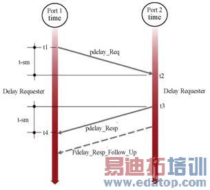 P2P对协议流程进行了优化,不只计算驻留时间,还计算出了链路时延,并把二者加在一起放到修正域中,逐跳传播累加,直到从设备。当从设备收到Sync报文时已经知道了总的传输时间和驻留时间,这样就可以直接计算出Offset并同步了,不用再发送时延请求,主设备也不用再回应时延应答了。P2P透明时钟通过和其相连的PTP设备交互对端时延请求报文和对端时延响应报文,能够知道4个时间t1,t2,t3,t4,通过Delay=[(t2-t1)+(t4-t3)]/2的计算方法算出链路时延(见图3)。