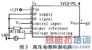 这里采用美国Ultravoh公司的高压电源模块。其中“V”系列的型号为1V12-P0.4电源模块,能完全满足该设计的需求,其输入电压为12V,输出电压为0~1000V,控制电压为0~5V,功率为0.4W。低功耗、体积小、重量轻,并带有输出电压监测和自保护电路。高压电源控制电路如图3所示。