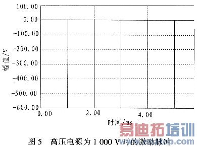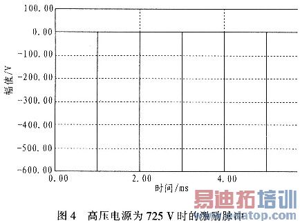 图5中,当高压电源输出最大为1000V,R1=10kΩ,R2=100Ω,C=0.01μF时,得到的激励脉冲约为830V,宽度为600ns。