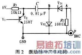 3)快速恢复型二极管Vd1、Vd2滤去充电脉冲,使A点只有放电时的负电压激励脉冲。