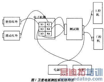 卫星地面测控系统主要由电源模块、电子机箱、测试箱、工控机以及红外地球敏感器构成,系统结构如图1所示。其中两台电源并联, 输出串联二极管。在整个测控系统中,测试箱的控制功能是通过Atmega128完成的。